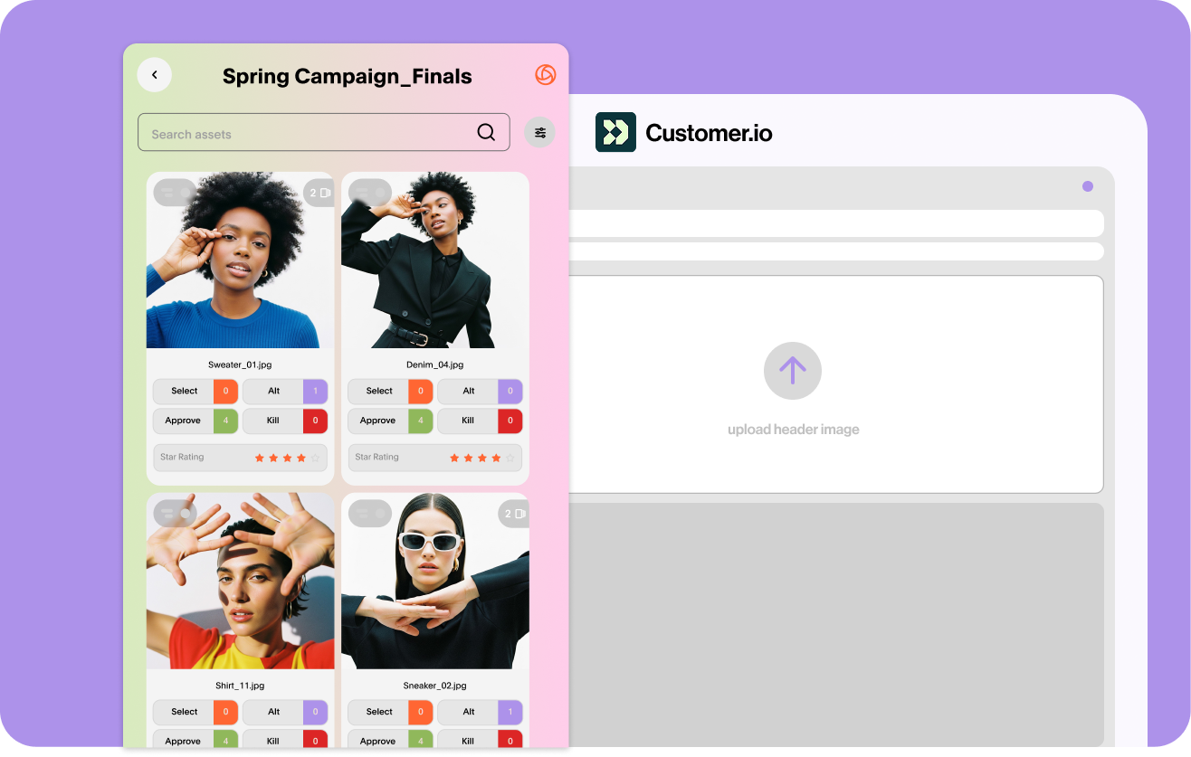 - Direct campaign integration: Browse and select approved assets straight from Customer.io campaigns and automation workflows without requesting files from creative