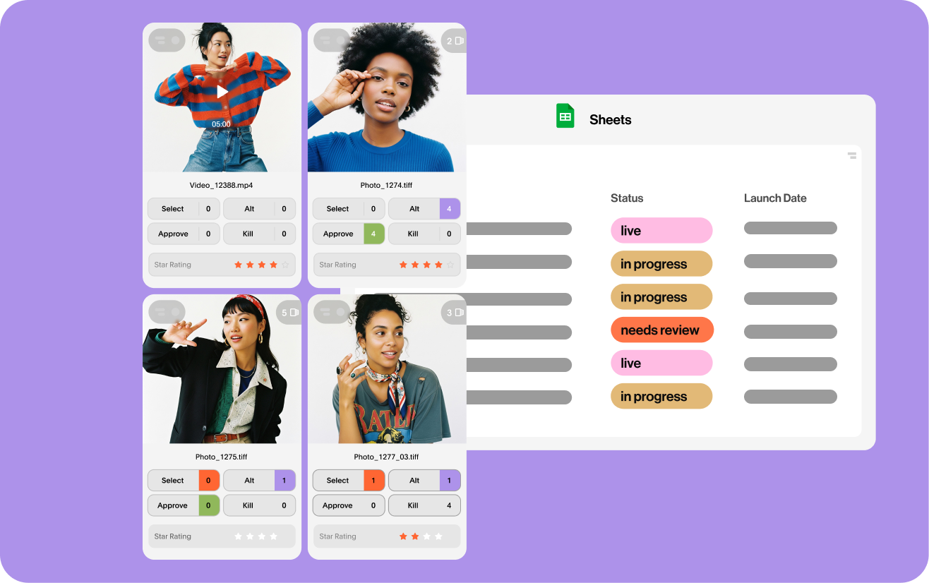 - Automatic project tracking: Asset metadata and approval status update in Google Sheets instantly as creative work progresses